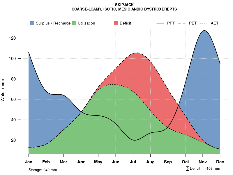 Monthly water balance estimated using a leaky-bucket style model for the SKIPJACK soil series. Monthly precipitation (PPT) and potential evapotranspiration (PET) have been estimated from the 50th percentile of gridded values (PRISM 1981-2010) overlapping with the extent of SSURGO map units containing each series as a major component. Monthly PET values were estimated using the method of Thornthwaite (1948). These (and other) climatic parameters are calculated with each SSURGO refresh and provided by the fetchOSD function of the soilDB package. Representative water storage values (“AWC” in the figures) were derived from SSURGO by taking the 50th percentile of profile-total water storage (sum[awc_r * horizon thickness]) for each soil series. Note that this representation of “water storage” is based on the average ability of most plants to extract soil water between 15 bar (“permanent wilting point”) and 1/3 bar (“field capacity”) matric potential. Soil moisture state can be roughly interpreted as “dry” when storage is depleted, “moist” when storage is between 0mm and AWC, and “wet” when there is a surplus. Clearly there are a lot of assumptions baked into this kind of monthly water balance. This is still a work in progress.