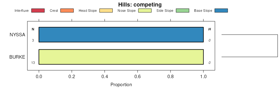 Geomorphic description summaries for the SLUKA series and competing. Series are sorted according to hierarchical clustering of proportions and relative hydrologic position within an idealized landform (e.g. top to bottom). Proportions can be interpreted as an aggregate representation of geomorphic membership. Most soil series (SSURGO components) are associated with a hillslope position and one or more landform-specific positions: hills, mountain slopes, terraces, and/or flats. The values printed to the left (number of component records) and right (Shannon entropy) of stacked bars can be used to judge the reliability of trends. Shannon entropy values close to 0 represent soil series with relatively consistent geomorphic association, while values close to 1 suggest lack thereof. Source: SSURGO component records .