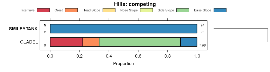 Geomorphic description summaries for the SMILEYTANK series and competing. Series are sorted according to hierarchical clustering of proportions and relative hydrologic position within an idealized landform (e.g. top to bottom). Proportions can be interpreted as an aggregate representation of geomorphic membership. Most soil series (SSURGO components) are associated with a hillslope position and one or more landform-specific positions: hills, mountain slopes, terraces, and/or flats. The values printed to the left (number of component records) and right (Shannon entropy) of stacked bars can be used to judge the reliability of trends. Shannon entropy values close to 0 represent soil series with relatively consistent geomorphic association, while values close to 1 suggest lack thereof. Source: SSURGO component records .
