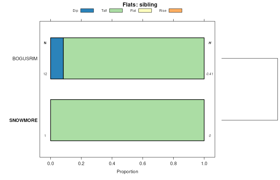 Geomorphic description summaries for the SNOWMORE series and siblings. Series are sorted according to hierarchical clustering of proportions and relative hydrologic position within an idealized landform (e.g. top to bottom). Most soil series (SSURGO components) are associated with a hillslope position and one or more landform-specific positions: hills, mountain slopes, terraces, and/or flats. Proportions can be interpreted as an aggregate representation of geomorphic membership. The values printed to the left (number of component records) and right (Shannon entropy) of stacked bars can be used to judge the reliability of trends. Small Shannon entropy values suggest relatively consistent geomorphic association, while larger values suggest lack thereof. Source: SSURGO component records .