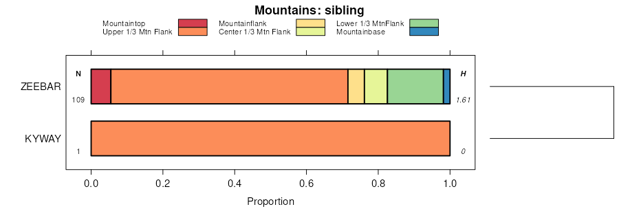 Geomorphic description summaries for the SPLITEN series and siblings. Series are sorted according to hierarchical clustering of proportions and relative hydrologic position within an idealized landform (e.g. top to bottom). Most soil series (SSURGO components) are associated with a hillslope position and one or more landform-specific positions: hills, mountain slopes, terraces, and/or flats. Proportions can be interpreted as an aggregate representation of geomorphic membership. The values printed to the left (number of component records) and right (Shannon entropy) of stacked bars can be used to judge the reliability of trends. Small Shannon entropy values suggest relatively consistent geomorphic association, while larger values suggest lack thereof. Source: SSURGO component records .