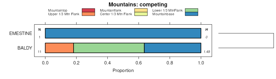 Geomorphic description summaries for the SQUIRRELCREEK series and competing. Series are sorted according to hierarchical clustering of proportions and relative hydrologic position within an idealized landform (e.g. top to bottom). Proportions can be interpreted as an aggregate representation of geomorphic membership. Most soil series (SSURGO components) are associated with a hillslope position and one or more landform-specific positions: hills, mountain slopes, terraces, and/or flats. The values printed to the left (number of component records) and right (Shannon entropy) of stacked bars can be used to judge the reliability of trends. Shannon entropy values close to 0 represent soil series with relatively consistent geomorphic association, while values close to 1 suggest lack thereof. Source: SSURGO component records .