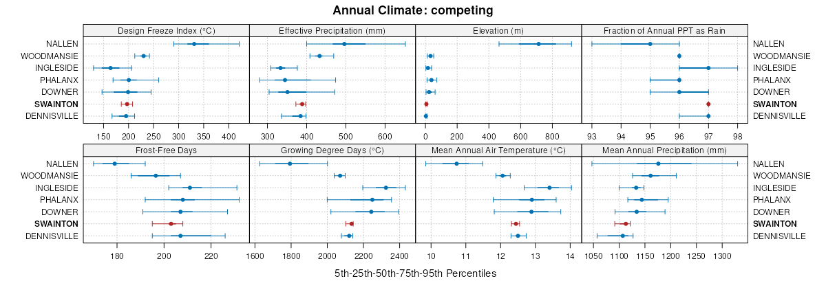 Select annual climate data summaries for the SWAINTON series and competing. Series are sorted according to hierarchical clustering of median values. Source: SSURGO map unit geometry and 1981-2010, 800m PRISM data .