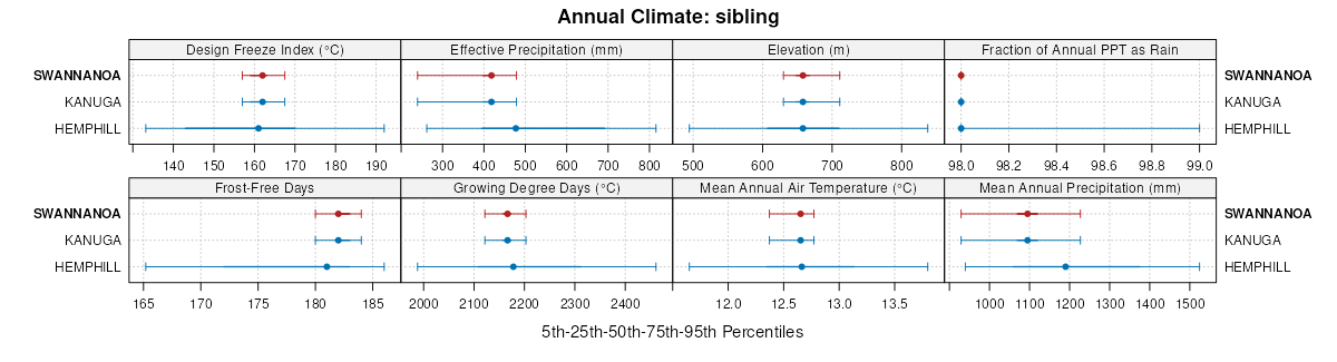 Select annual climate data summaries for the SWANNANOA series and competing. Series are sorted according to hierarchical clustering of median values. Source: SSURGO map unit geometry and 1981-2010, 800m PRISM data .