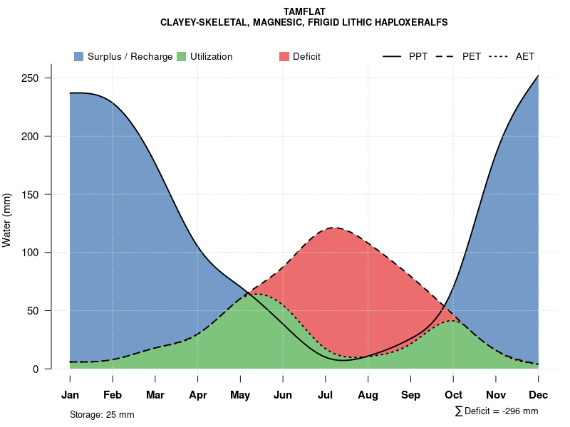 Monthly water balance estimated using a leaky-bucket style model for the TAMFLAT soil series. Monthly precipitation (PPT) and potential evapotranspiration (PET) have been estimated from the 50th percentile of gridded values (PRISM 1981-2010) overlapping with the extent of SSURGO map units containing each series as a major component. Monthly PET values were estimated using the method of Thornthwaite (1948). These (and other) climatic parameters are calculated with each SSURGO refresh and provided by the fetchOSD function of the soilDB package. Representative water storage values (“AWC” in the figures) were derived from SSURGO by taking the 50th percentile of profile-total water storage (sum[awc_r * horizon thickness]) for each soil series. Note that this representation of “water storage” is based on the average ability of most plants to extract soil water between 15 bar (“permanent wilting point”) and 1/3 bar (“field capacity”) matric potential. Soil moisture state can be roughly interpreted as “dry” when storage is depleted, “moist” when storage is between 0mm and AWC, and “wet” when there is a surplus. Clearly there are a lot of assumptions baked into this kind of monthly water balance. This is still a work in progress.
