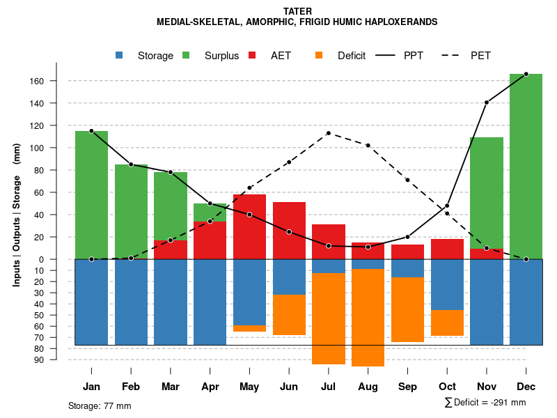 Monthly water balance estimated using a leaky-bucket style model for the TATER soil series. Monthly precipitation (PPT) and potential evapotranspiration (PET) have been estimated from the 50th percentile of gridded values (PRISM 1981-2010) overlapping with the extent of SSURGO map units containing each series as a major component. Monthly PET values were estimated using the method of Thornthwaite (1948). These (and other) climatic parameters are calculated with each SSURGO refresh and provided by the fetchOSD function of the soilDB package. Representative water storage values (“AWC” in the figures) were derived from SSURGO by taking the 50th percentile of profile-total water storage (sum[awc_r * horizon thickness]) for each soil series. Note that this representation of “water storage” is based on the average ability of most plants to extract soil water between 15 bar (“permanent wilting point”) and 1/3 bar (“field capacity”) matric potential. Soil moisture state can be roughly interpreted as “dry” when storage is depleted, “moist” when storage is between 0mm and AWC, and “wet” when there is a surplus. Clearly there are a lot of assumptions baked into this kind of monthly water balance. This is still a work in progress.
