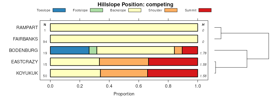 Geomorphic description summaries for the TOGHOTTHELE series and competing. Series are sorted according to hierarchical clustering of proportions and relative hydrologic position within an idealized landform (e.g. top to bottom). Proportions can be interpreted as an aggregate representation of geomorphic membership. Most soil series (SSURGO components) are associated with a hillslope position and one or more landform-specific positions: hills, mountain slopes, terraces, and/or flats. The values printed to the left (number of component records) and right (Shannon entropy) of stacked bars can be used to judge the reliability of trends. Shannon entropy values close to 0 represent soil series with relatively consistent geomorphic association, while values close to 1 suggest lack thereof. Source: SSURGO component records .