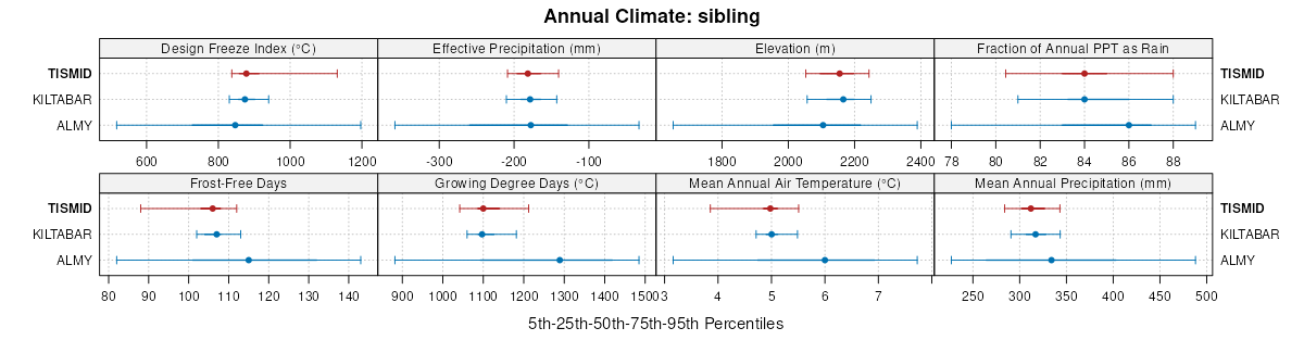 Select annual climate data summaries for the TISMID series and competing. Series are sorted according to hierarchical clustering of median values. Source: SSURGO map unit geometry and 1981-2010, 800m PRISM data .