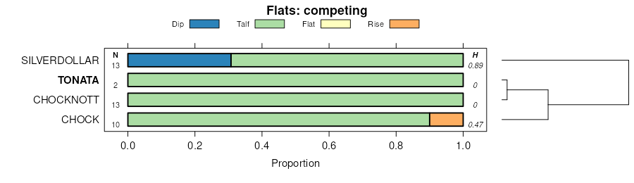 Geomorphic description summaries for the TONATA series and competing. Series are sorted according to hierarchical clustering of proportions and relative hydrologic position within an idealized landform (e.g. top to bottom). Proportions can be interpreted as an aggregate representation of geomorphic membership. Most soil series (SSURGO components) are associated with a hillslope position and one or more landform-specific positions: hills, mountain slopes, terraces, and/or flats. The values printed to the left (number of component records) and right (Shannon entropy) of stacked bars can be used to judge the reliability of trends. Shannon entropy values close to 0 represent soil series with relatively consistent geomorphic association, while values close to 1 suggest lack thereof. Source: SSURGO component records .
