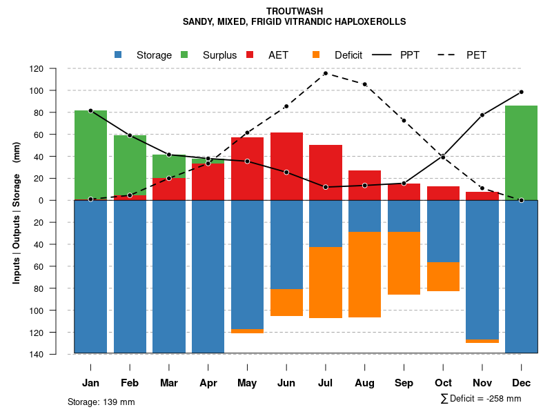 Monthly water balance estimated using a leaky-bucket style model for the TROUTWASH soil series. Monthly precipitation (PPT) and potential evapotranspiration (PET) have been estimated from the 50th percentile of gridded values (PRISM 1981-2010) overlapping with the extent of SSURGO map units containing each series as a major component. Monthly PET values were estimated using the method of Thornthwaite (1948). These (and other) climatic parameters are calculated with each SSURGO refresh and provided by the fetchOSD function of the soilDB package. Representative water storage values (“AWC” in the figures) were derived from SSURGO by taking the 50th percentile of profile-total water storage (sum[awc_r * horizon thickness]) for each soil series. Note that this representation of “water storage” is based on the average ability of most plants to extract soil water between 15 bar (“permanent wilting point”) and 1/3 bar (“field capacity”) matric potential. Soil moisture state can be roughly interpreted as “dry” when storage is depleted, “moist” when storage is between 0mm and AWC, and “wet” when there is a surplus. Clearly there are a lot of assumptions baked into this kind of monthly water balance. This is still a work in progress.