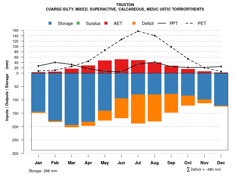 Monthly water balance estimated using a leaky-bucket style model for the TRUXTON soil series. Monthly precipitation (PPT) and potential evapotranspiration (PET) have been estimated from the 50th percentile of gridded values (PRISM 1981-2010) overlapping with the extent of SSURGO map units containing each series as a major component. Monthly PET values were estimated using the method of Thornthwaite (1948). These (and other) climatic parameters are calculated with each SSURGO refresh and provided by the fetchOSD function of the soilDB package. Representative water storage values (“AWC” in the figures) were derived from SSURGO by taking the 50th percentile of profile-total water storage (sum[awc_r * horizon thickness]) for each soil series. Note that this representation of “water storage” is based on the average ability of most plants to extract soil water between 15 bar (“permanent wilting point”) and 1/3 bar (“field capacity”) matric potential. Soil moisture state can be roughly interpreted as “dry” when storage is depleted, “moist” when storage is between 0mm and AWC, and “wet” when there is a surplus. Clearly there are a lot of assumptions baked into this kind of monthly water balance. This is still a work in progress.