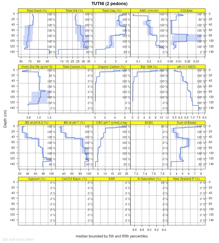 Aggregate lab data for the TUTNI soil series. This aggregation is based on all pedons with a current taxon name of TUTNI, and applied along 1-cm thick depth slices. Solid lines are the slice-wise median, bounded on either side by the interval defined by the slice-wise 5th and 95th percentiles. The median is the value that splits the data in half. Five percent of the data are less than the 5th percentile, and five percent of the data are greater than the 95th percentile. Values along the right hand side y-axis describe the proportion of pedon data that contribute to aggregate values at this depth. For example, a value of "90%" at 25cm means that 90% of the pedons correlated to TUTNI were used in the calculation. Source: KSSL snapshot . Methods used to assemble the KSSL snapshot used by SoilWeb / SDE