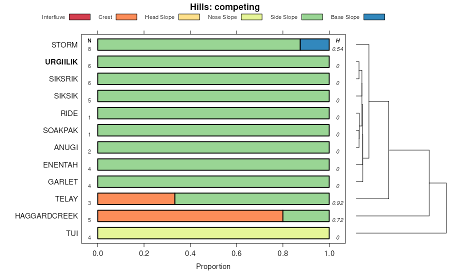 Geomorphic description summaries for the URGIILIK series and siblings. Series are sorted according to hierarchical clustering of proportions and relative hydrologic position within an idealized landform (e.g. top to bottom). Most soil series (SSURGO components) are associated with a hillslope position and one or more landform-specific positions: hills, mountain slopes, terraces, and/or flats. Proportions can be interpreted as an aggregate representation of geomorphic membership. The values printed to the left (number of component records) and right (Shannon entropy) of stacked bars can be used to judge the reliability of trends. Small Shannon entropy values suggest relatively consistent geomorphic association, while larger values suggest lack thereof. Source: SSURGO component records .