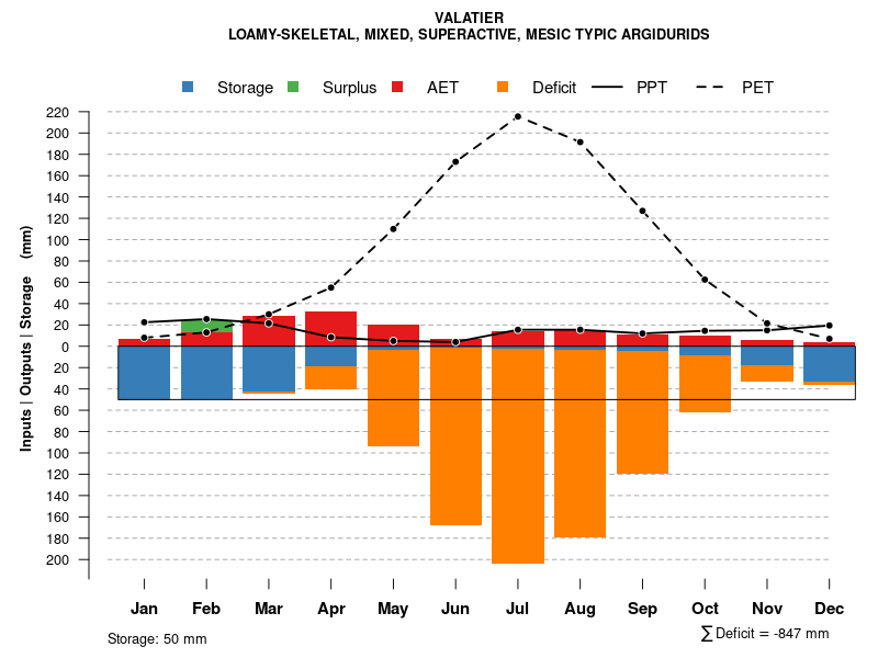 Monthly water balance estimated using a leaky-bucket style model for the VALATIER soil series. Monthly precipitation (PPT) and potential evapotranspiration (PET) have been estimated from the 50th percentile of gridded values (PRISM 1981-2010) overlapping with the extent of SSURGO map units containing each series as a major component. Monthly PET values were estimated using the method of Thornthwaite (1948). These (and other) climatic parameters are calculated with each SSURGO refresh and provided by the fetchOSD function of the soilDB package. Representative water storage values (“AWC” in the figures) were derived from SSURGO by taking the 50th percentile of profile-total water storage (sum[awc_r * horizon thickness]) for each soil series. Note that this representation of “water storage” is based on the average ability of most plants to extract soil water between 15 bar (“permanent wilting point”) and 1/3 bar (“field capacity”) matric potential. Soil moisture state can be roughly interpreted as “dry” when storage is depleted, “moist” when storage is between 0mm and AWC, and “wet” when there is a surplus. Clearly there are a lot of assumptions baked into this kind of monthly water balance. This is still a work in progress.