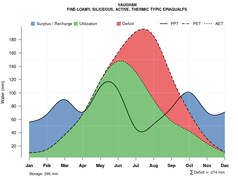 Monthly water balance estimated using a leaky-bucket style model for the VAUGHAN soil series. Monthly precipitation (PPT) and potential evapotranspiration (PET) have been estimated from the 50th percentile of gridded values (PRISM 1981-2010) overlapping with the extent of SSURGO map units containing each series as a major component. Monthly PET values were estimated using the method of Thornthwaite (1948). These (and other) climatic parameters are calculated with each SSURGO refresh and provided by the fetchOSD function of the soilDB package. Representative water storage values (“AWC” in the figures) were derived from SSURGO by taking the 50th percentile of profile-total water storage (sum[awc_r * horizon thickness]) for each soil series. Note that this representation of “water storage” is based on the average ability of most plants to extract soil water between 15 bar (“permanent wilting point”) and 1/3 bar (“field capacity”) matric potential. Soil moisture state can be roughly interpreted as “dry” when storage is depleted, “moist” when storage is between 0mm and AWC, and “wet” when there is a surplus. Clearly there are a lot of assumptions baked into this kind of monthly water balance. This is still a work in progress.