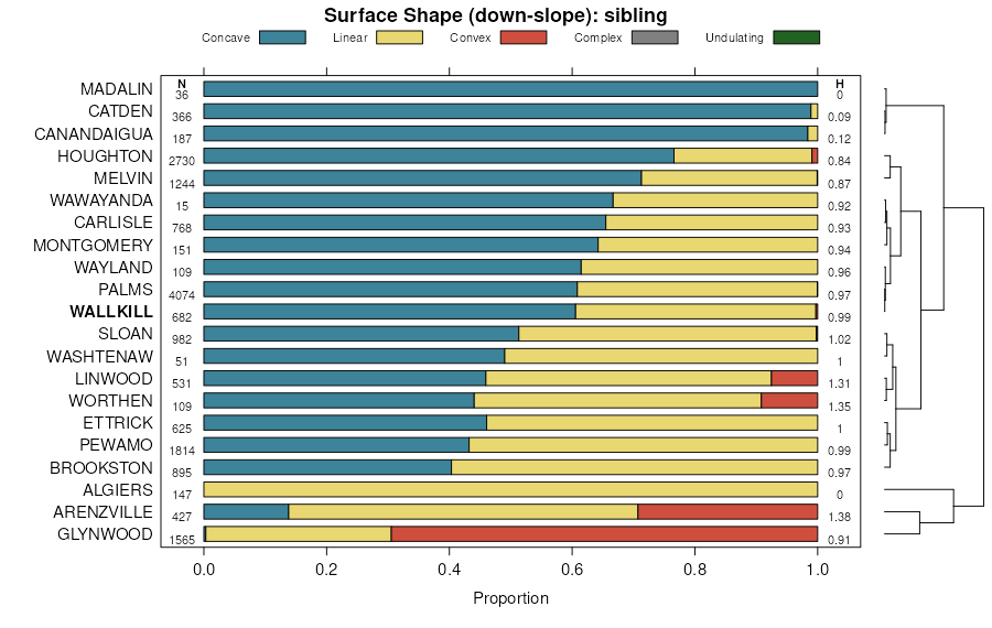 Geomorphic description summaries for the WALLKILL series and competing. Series are sorted according to hierarchical clustering of proportions and relative hydrologic position within an idealized landform (e.g. top to bottom). Most soil series (SSURGO components) are associated with a two-dimensional hillslope position and one or more landform-specific, three-dimensional positions: hills, mountain slopes, terraces, and/or flats. The land surface curvature is described across-slope and down-slope. Proportions can be interpreted as an aggregate representation of geomorphic membership. The values printed to the left (number of component records) and right (Shannon entropy) of stacked bars can be used to judge the reliability of trends. Small Shannon entropy values suggest relatively consistent geomorphic association, while larger values suggest lack thereof. Source: SSURGO component records . Learn more about how these data were prepared.
