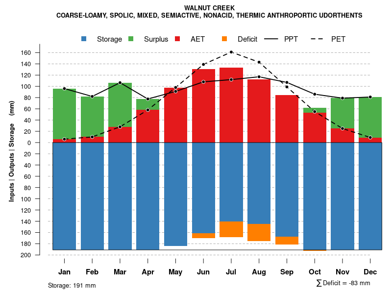 Monthly water balance estimated using a leaky-bucket style model for the WALNUT CREEK soil series. Monthly precipitation (PPT) and potential evapotranspiration (PET) have been estimated from the 50th percentile of gridded values (PRISM 1981-2010) overlapping with the extent of SSURGO map units containing each series as a major component. Monthly PET values were estimated using the method of Thornthwaite (1948). These (and other) climatic parameters are calculated with each SSURGO refresh and provided by the fetchOSD function of the soilDB package. Representative water storage values (“AWC” in the figures) were derived from SSURGO by taking the 50th percentile of profile-total water storage (sum[awc_r * horizon thickness]) for each soil series. Note that this representation of “water storage” is based on the average ability of most plants to extract soil water between 15 bar (“permanent wilting point”) and 1/3 bar (“field capacity”) matric potential. Soil moisture state can be roughly interpreted as “dry” when storage is depleted, “moist” when storage is between 0mm and AWC, and “wet” when there is a surplus. Clearly there are a lot of assumptions baked into this kind of monthly water balance. This is still a work in progress.