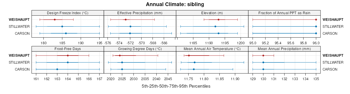 Select annual climate data summaries for the WEISHAUPT series and competing. Series are sorted according to hierarchical clustering of median values. Source: SSURGO map unit geometry and 1981-2010, 800m PRISM data .