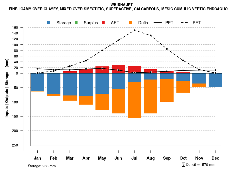Monthly water balance estimated using a leaky-bucket style model for the WEISHAUPT soil series. Monthly precipitation (PPT) and potential evapotranspiration (PET) have been estimated from the 50th percentile of gridded values (PRISM 1981-2010) overlapping with the extent of SSURGO map units containing each series as a major component. Monthly PET values were estimated using the method of Thornthwaite (1948). These (and other) climatic parameters are calculated with each SSURGO refresh and provided by the fetchOSD function of the soilDB package. Representative water storage values (“AWC” in the figures) were derived from SSURGO by taking the 50th percentile of profile-total water storage (sum[awc_r * horizon thickness]) for each soil series. Note that this representation of “water storage” is based on the average ability of most plants to extract soil water between 15 bar (“permanent wilting point”) and 1/3 bar (“field capacity”) matric potential. Soil moisture state can be roughly interpreted as “dry” when storage is depleted, “moist” when storage is between 0mm and AWC, and “wet” when there is a surplus. Clearly there are a lot of assumptions baked into this kind of monthly water balance. This is still a work in progress.