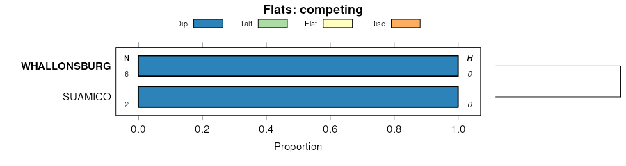 Geomorphic description summaries for the WHALLONSBURG series and siblings. Series are sorted according to hierarchical clustering of proportions and relative hydrologic position within an idealized landform (e.g. top to bottom). Most soil series (SSURGO components) are associated with a hillslope position and one or more landform-specific positions: hills, mountain slopes, terraces, and/or flats. Proportions can be interpreted as an aggregate representation of geomorphic membership. The values printed to the left (number of component records) and right (Shannon entropy) of stacked bars can be used to judge the reliability of trends. Small Shannon entropy values suggest relatively consistent geomorphic association, while larger values suggest lack thereof. Source: SSURGO component records .