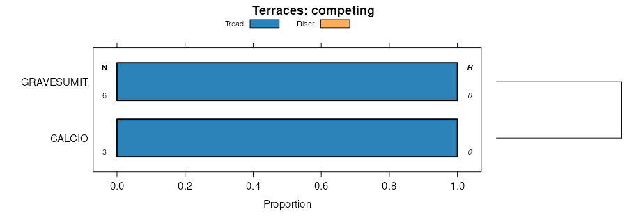 Geomorphic description summaries for the YUCCA series and competing. Series are sorted according to hierarchical clustering of proportions and relative hydrologic position within an idealized landform (e.g. top to bottom). Proportions can be interpreted as an aggregate representation of geomorphic membership. Most soil series (SSURGO components) are associated with a hillslope position and one or more landform-specific positions: hills, mountain slopes, terraces, and/or flats. The values printed to the left (number of component records) and right (Shannon entropy) of stacked bars can be used to judge the reliability of trends. Shannon entropy values close to 0 represent soil series with relatively consistent geomorphic association, while values close to 1 suggest lack thereof. Source: SSURGO component records .