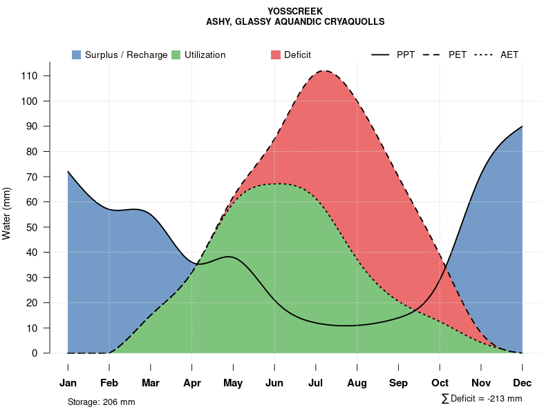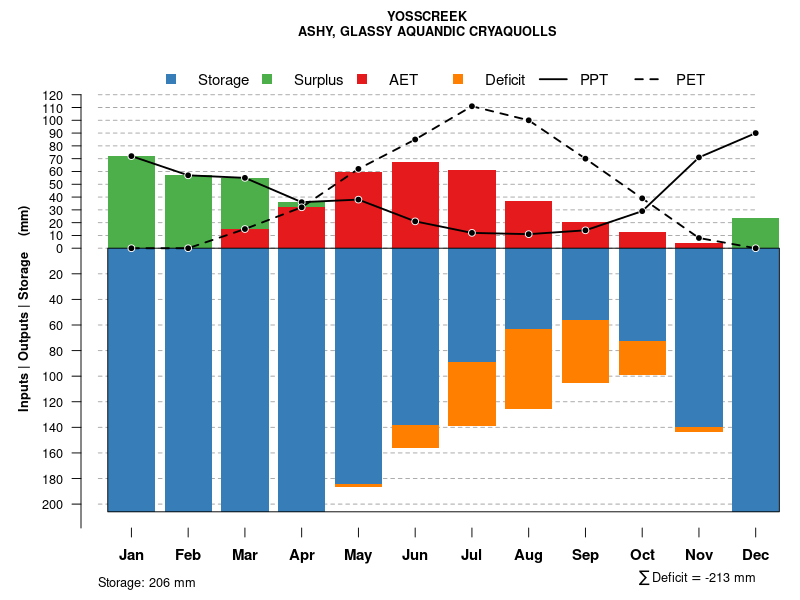 Monthly water balance estimated using a leaky-bucket style model for the YOSSCREEK soil series. Monthly precipitation (PPT) and potential evapotranspiration (PET) have been estimated from the 50th percentile of gridded values (PRISM 1981-2010) overlapping with the extent of SSURGO map units containing each series as a major component. Monthly PET values were estimated using the method of Thornthwaite (1948). These (and other) climatic parameters are calculated with each SSURGO refresh and provided by the fetchOSD function of the soilDB package. Representative water storage values (“AWC” in the figures) were derived from SSURGO by taking the 50th percentile of profile-total water storage (sum[awc_r * horizon thickness]) for each soil series. Note that this representation of “water storage” is based on the average ability of most plants to extract soil water between 15 bar (“permanent wilting point”) and 1/3 bar (“field capacity”) matric potential. Soil moisture state can be roughly interpreted as “dry” when storage is depleted, “moist” when storage is between 0mm and AWC, and “wet” when there is a surplus. Clearly there are a lot of assumptions baked into this kind of monthly water balance. This is still a work in progress.