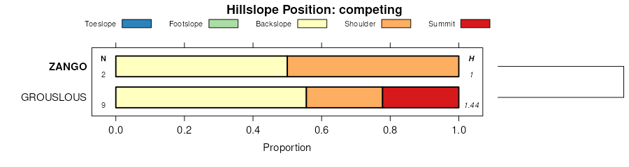 Geomorphic description summaries for the ZANGO series and competing. Series are sorted according to hierarchical clustering of proportions and relative hydrologic position within an idealized landform (e.g. top to bottom). Proportions can be interpreted as an aggregate representation of geomorphic membership. Most soil series (SSURGO components) are associated with a hillslope position and one or more landform-specific positions: hills, mountain slopes, terraces, and/or flats. The values printed to the left (number of component records) and right (Shannon entropy) of stacked bars can be used to judge the reliability of trends. Shannon entropy values close to 0 represent soil series with relatively consistent geomorphic association, while values close to 1 suggest lack thereof. Source: SSURGO component records .